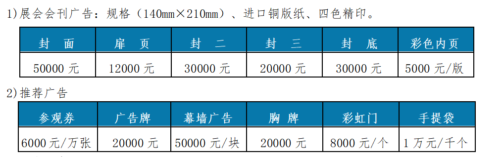 注:A.標準展位配備:展位地毯鋪設、中英文雙語楣板字、咨詢桌一張、折椅兩把、射燈或日光燈兩個、220V 插座一個。B.訂光地的展商自行負責展位布置的所需費用。