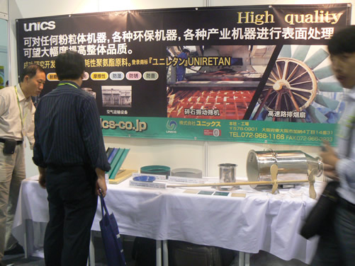 來自日本的株式會(huì)社尤尼科斯展示了其獨(dú)自己開發(fā)的廣泛用于提升振動(dòng)篩分設(shè)備篩網(wǎng)耐磨及防堵孔的聚氨酯涂層技術(shù)“UN1系列”。通過對(duì)振動(dòng)篩篩網(wǎng)做聚氨酯涂層表面處理避免了金屬和金屬間的直接接觸,防止了金屬磨耗以及磨耗的混入,大大降低了與粉體顆粒的摩擦所造成的篩網(wǎng)磨損。