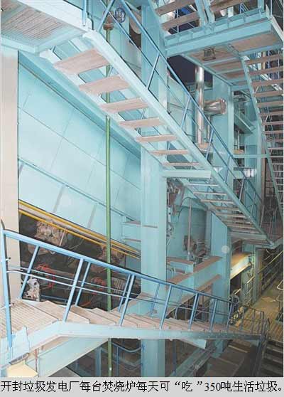 走進(jìn)該廠大門,記者看到一棟高大的建筑,該廠工程師劉濤說這就是生產(chǎn)主廠房,高40多米。乘坐電梯,記者首先來到了4樓的垃圾處理池上方的操作間。記者看到,一名工人坐在操作臺上操作著按鈕,并隔著厚厚的玻璃罩觀察著垃圾處理池上方的抓吊,抓吊重復(fù)地把垃圾抓起放入焚燒爐送料口中。劉濤說:“這個垃圾池可容納1萬方生活垃圾,環(huán)衛(wèi)車把垃圾直接送到垃圾池中,經(jīng)過一個星期的自然發(fā)酵后,垃圾就可以投入焚燒爐焚燒。”從垃圾池操作臺走出來,記者又乘坐電梯下行,來到焚燒爐旁邊,瞬間感覺到熱浪撲面而來。劉濤說:“這個焚燒爐一共有3臺,每臺每天可以焚燒350噸垃圾,現(xiàn)在只開了兩臺。”踏著鋼梯往下走一段距離后,他打開一個觀察孔讓記者看,記者看到里面正熊熊燃燒,冒著紅黃色火焰。他說:“850℃高溫,不管什么樣的生活垃圾都能給燒成灰!”在焚燒爐的排渣口,記者看到垃圾焚燒后都變成了灰色的渣料。這是做環(huán)保磚的原料,一座制磚廠正在建設(shè)。登梯返回又轉(zhuǎn)過幾個彎,一間房內(nèi)又傳來嗡嗡的響聲,這就是發(fā)電車間了。劉濤說:“焚燒爐焚燒垃圾產(chǎn)生的高溫高壓蒸汽通過管道輸送到汽輪機(jī)內(nèi),汽輪機(jī)再驅(qū)動著發(fā)電機(jī),電能就源源不斷產(chǎn)生了,配備的兩臺9MW凝汽式汽輪發(fā)電機(jī),年上網(wǎng)電量約1億度。”