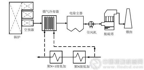 在凝結(jié)水方面,從N級(jí)低壓加熱器入口抽取一部分凝結(jié)水,進(jìn)入煙氣冷卻器后被加熱,返回至N+1級(jí)(按實(shí)際情況而定)低壓加熱器出口,從而節(jié)省低壓加熱器的抽汽,增加汽輪機(jī)的做功,節(jié)省煤耗。