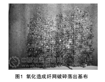 其分子主鏈由苯環(huán)在對位上連接硫原子而形成大分子主鍵,其結(jié)構(gòu)中至少有85%的硫醚鍵(-S-)是直接結(jié)合在兩個(gè)芳香族環(huán)之中。在高溫(150℃)條件下,即氧分子攻擊分子中的“-S-”鍵,并與之結(jié)合,生成SOx。使大分子鏈被擊碎,變成小分子結(jié)構(gòu)。由于苯環(huán)提供PPS纖維以剛性,而硫醚則提供PPS纖維以柔順性。因此,當(dāng)煙氣中的氧或氧化劑與PPS纖維中的-S-結(jié)合生成SOx,造成PPS纖維變色、變硬、變脆,強(qiáng)度降低而破損,嚴(yán)重時(shí)纖網(wǎng)會破碎而脫離基布(見圖1)