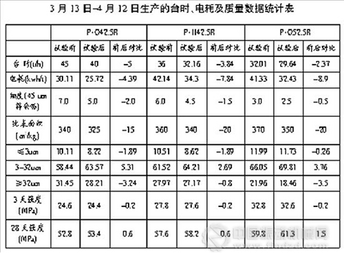 與此同時,在其它條件不變的情況下,各品種水泥45um篩余細(xì)度降低,比表面積降低,28天強(qiáng)度略有上升;在填充率略有提高的情況下,裝載量大幅度降低,水泥磨主電機(jī)電流由105A降至70A,從而大大降低了主電機(jī)、減速機(jī)等主機(jī)設(shè)備的負(fù)載,有利于設(shè)備安全長期運(yùn)轉(zhuǎn),降低了設(shè)備損耗,減少了維修費(fèi)用。