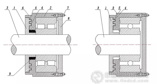 注:1-內(nèi)密封圈,2-外密封圈,3-軸,4-環(huán)形凸臺和凹槽 5-間隙通道,6-環(huán)形平臺,7-螺栓,8-軸承擋蓋 9-橡膠密封圈