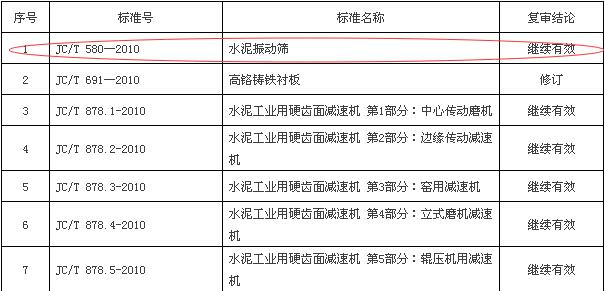 根據(jù)上級主管部門的要求和我標(biāo)委會年度工作計劃,標(biāo)委會對2010年以前制定的JC/T 580-2010《水泥振動篩》等13項行業(yè)標(biāo)準(zhǔn)項目進(jìn)行了清理,并以函審的方式組織標(biāo)委會委員進(jìn)行了復(fù)審,根據(jù)標(biāo)準(zhǔn)現(xiàn)狀和行業(yè)實際情況,從標(biāo)準(zhǔn)的全局性、政策性、科學(xué)性入手,形成復(fù)審意見:對標(biāo)準(zhǔn)的技術(shù)內(nèi)容仍符合當(dāng)前技術(shù)水平,滿足行業(yè)發(fā)展和市場需要的JC/T 580-2010《水泥振動篩》等10項行業(yè)標(biāo)準(zhǔn)確定為繼續(xù)有效。