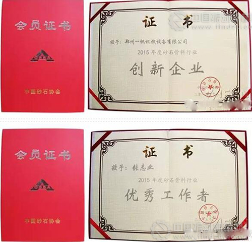 作為砂石骨料行業(yè)專家的鄭州一帆機械,在此次大會中非常榮幸的獲得了《2015年度砂石骨料行業(yè)創(chuàng)新企業(yè)》的榮譽稱號并頒發(fā)了證書;公司總經(jīng)理張志業(yè)以及銷售總監(jiān)張現(xiàn)團同時獲得《2015年度砂石骨料行業(yè)優(yōu)秀工作者》的榮譽,其中張現(xiàn)團總監(jiān)還被協(xié)會聘請為中國砂石協(xié)會第七屆理事會專家委員會委員。