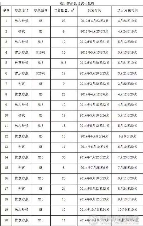 濕拌砂漿按用途分為濕拌砌筑砂漿,濕拌抹灰砂漿,濕拌地面砂漿和濕拌防水砂漿。濕拌砌筑砂漿的強度等級包括:M5、M7.5、M10、M15、M20、M25、M30,濕拌抹灰砂漿的強度等級包括:M5、M10、M15、M20。廣州東塔項目主要使用的新概念濕拌砌筑砂漿和濕拌抹灰砂漿,用量最大的強度等級是M5和M15。項目應(yīng)用場合主要是主塔樓112層中內(nèi)墻砌筑、抹灰和巨柱抹灰工程等。自2013年4月份開始使用廣州天華混凝土有限公司旗下攪拌站生產(chǎn)新概念濕拌砂漿,截止到2014年10月,內(nèi)墻抹灰和砌筑總施工面積約100萬m2,巨型柱飾面已施工面積7萬m2。 表1是筆者所在商品砂漿企業(yè)部分生產(chǎn)與配送訂單記錄,通過實踐證明了攪拌站晚上集中生產(chǎn)、集中配送濕拌砂漿可行性。