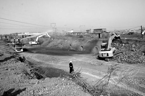 隨著一聲令下,挖掘機(jī)轟隆隆地開始搗毀磚瓦廠,為了防止揚(yáng)塵四起,一旁的消防隊(duì)員將數(shù)米高的水柱噴向現(xiàn)場,不一會(huì)兒,這個(gè)帶給周邊村民噪音和環(huán)境污染的磚瓦廠便“瓦解”了。當(dāng)天,大兆街辦另外2家白灰廠,1家砂石廠和1家磚瓦廠也被現(xiàn)場取締。
