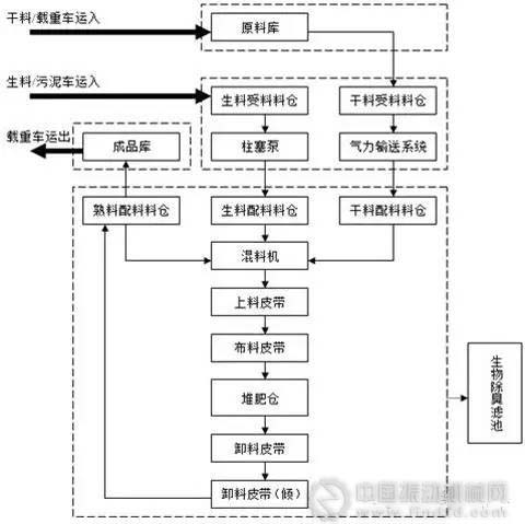 沈陽項(xiàng)目總體采用SIEMENS公司IPS堆肥系統(tǒng)構(gòu)架,結(jié)合國(guó)內(nèi)SACT堆肥系統(tǒng)特點(diǎn)進(jìn)行細(xì)部?jī)?yōu)化:發(fā)酵槽長(zhǎng)90m,寬3.05m,深2.5m(物料有效深度2.4m);共設(shè)置96座發(fā)酵槽,好氧發(fā)酵設(shè)計(jì)停留時(shí)間22d;配備8臺(tái)Wide3.0翻堆設(shè)備,起混合攪拌和倒垛作用,進(jìn)槽采用皮帶式布料機(jī),出槽采用出料皮帶式輸送機(jī);曝氣系統(tǒng)采用分段曝氣形式,每座發(fā)酵槽由6臺(tái)離心式通風(fēng)機(jī)正壓供風(fēng),設(shè)計(jì)最大曝氣強(qiáng)度0.3m3/(m3˙min);設(shè)置除臭系統(tǒng),終端采用生物除臭濾池,設(shè)計(jì)處理能力達(dá)到140×104m3/h。工藝流程如下圖所示。