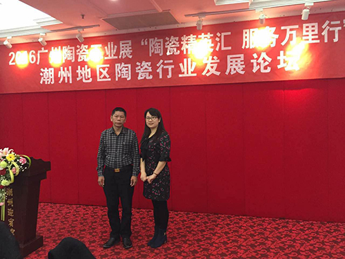 廣東歐美爾工貿(mào)實業(yè)有限公司陳喻生總經(jīng)理作為企業(yè)代表在會上進行了發(fā)言,表示在形勢不好的情形下,陶瓷企業(yè)要積極應(yīng)對,在國家政策和行業(yè)組織的引導(dǎo)下力圖突圍,成功轉(zhuǎn)型。潮州市政府部門和各地方行業(yè)協(xié)會都對此會予以高度重視,潮州市陶瓷原料行業(yè)協(xié)會秘書長劉澤榮、潮州市花紙印刷行業(yè)協(xié)會秘書長陳培金、潮安古巷陶瓷協(xié)會秘書長陳定鵬、潮州市建筑衛(wèi)生陶瓷行業(yè)協(xié)會秘書長張揚、潮州市貿(mào)促會(潮州市國際商會)會長陳敏等領(lǐng)導(dǎo)相繼上臺講話,給當(dāng)?shù)靥沾善髽I(yè)以信心,對2016廣州陶瓷工業(yè)展服務(wù)萬里行來到潮州表示感謝,并預(yù)祝陶瓷展取得圓滿成功。