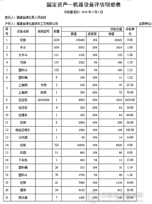 1、被執(zhí)行人福建省德化鑫榮發(fā)工藝有限公司在租賃廠房內(nèi)的坯架、坯板、球磨機等生產(chǎn)設(shè)備若干,詳見以下列表: