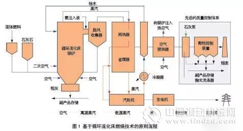 循環(huán)流化床燃燒技術(shù)是20 世紀(jì)70 年代末開始出現(xiàn)的潔凈煤燃燒技術(shù)。直到1985年該技術(shù)才開始用于發(fā)電(圖1為循環(huán)流化床原則流程)。循環(huán)流化床的基本概念是,只要氣體流速足夠高,氣流就可以從鍋爐中帶走固體顆粒。氣流通過固體分離器(通常為高溫旋風(fēng)分離器),將分離出來的床料和灰送到爐膛的最底端,從而防止未燃燃料離開鍋爐,這就形成了一個循環(huán)回路。燃料顆粒會在該回路中循環(huán)10~50 次,直到實現(xiàn)完全燃燒。此外,延長燃燒時間會使溫度(800~900℃)低于燃燒煤粉的溫度(1400~1600℃),而后者的效率更低。