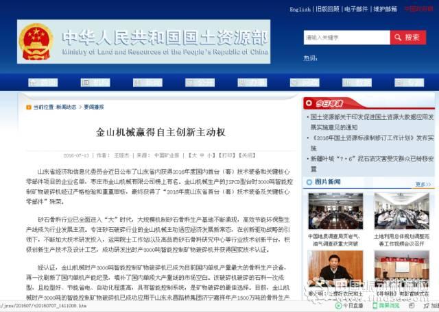 ?。▓D)為金山機械榮登國土資源部首頁要聞截圖