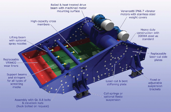 振動篩是模塊化設(shè)計的。如果需要更換,所有部件都可更換。懸掛角度可調(diào),暴露部件和大容量橫梁和縱梁的適當(dāng)磨損保護(hù)也納入設(shè)計中。屏幕能夠承受與振動相關(guān)的高加速度力。準(zhǔn)確地設(shè)計了所使用的篩選孔的正確的行程/速度比。它可用于圓形或直線運(yùn)動配置。可提供各種篩選介質(zhì),以滿足所需的應(yīng)用。