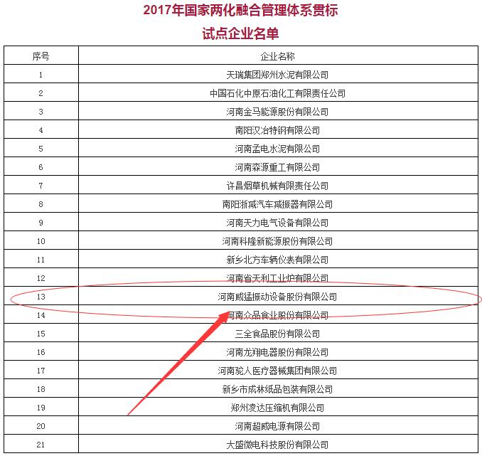 近日,工業(yè)和信息化部公布了2017年兩化融合管理體系貫標試點企業(yè)名單,河南威猛振動設備股份公司等21家企業(yè)成功入選。