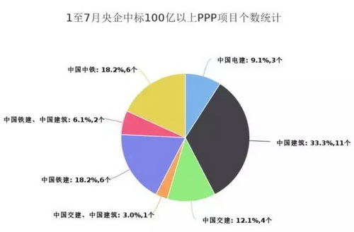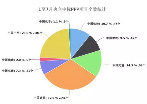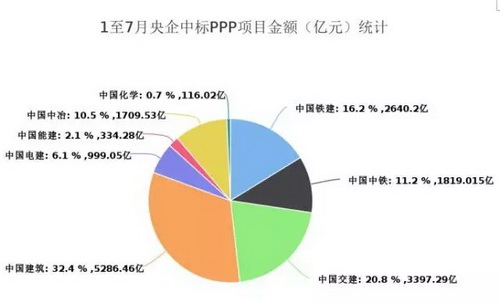 根據(jù)統(tǒng)計(jì),1-7月中國鐵建、中國中鐵、中國交建、中國建筑、中國電建、中國能建、中國中冶、中國化學(xué)這八家央企中標(biāo)PPP項(xiàng)目共計(jì)429個(gè),總投資額高達(dá)15397.74億元。