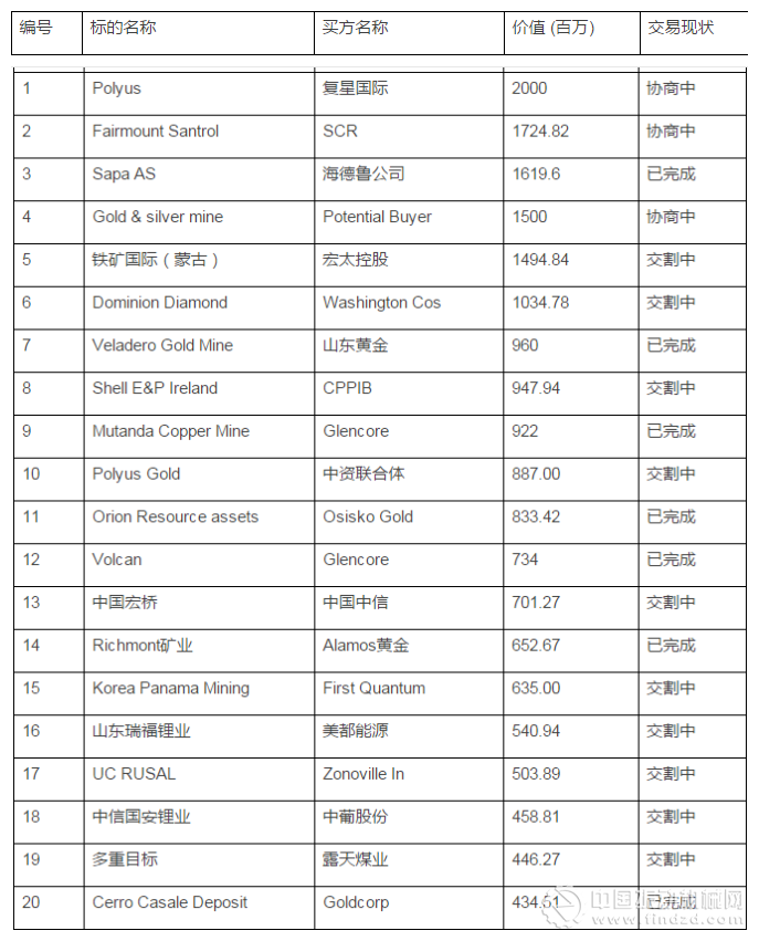 截止11月末的統(tǒng)計(jì)數(shù)據(jù)顯示,在金額大于1億美元的采礦并購(gòu)項(xiàng)目中,三分之一的買方為中資背景企業(yè);而在金額規(guī)模前20的案件中,8個(gè)項(xiàng)目的買方為中資企業(yè)。