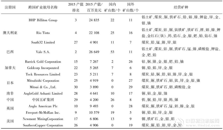10大礦產(chǎn)資源國(guó)中,有15個(gè)礦業(yè)公司進(jìn)入了跨國(guó)礦業(yè)航母行列。其中,美國(guó)、澳大利亞、加拿大各有3個(gè),日本有2個(gè),英國(guó)、中國(guó)、南非、巴西各有1個(gè),俄羅斯和印度沒(méi)有跨過(guò)礦業(yè)公司。