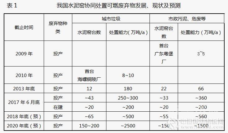 根據(jù)中國建材聯(lián)合會2017年7月內(nèi)部統(tǒng)計資料,以及水泥工業(yè)“十三、五”有關規(guī)劃目標,我國水泥窯協(xié)同處置可燃廢棄物現(xiàn)狀及其近期預測可整理成表1所示。因統(tǒng)計資料不夠很完整準確,加之情況變化很快,其中數(shù)據(jù)難以精準,但具有足夠的精確度。