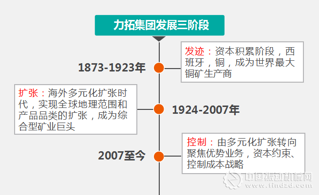 力拓1873年成立,從西班牙到全世界,與資本共舞了144年,從默默無(wú)聞到成長(zhǎng)為世界最大的跨國(guó)綜合礦業(yè)公司之一。其成長(zhǎng)歷程大概可以總結(jié)為三個(gè)階段。