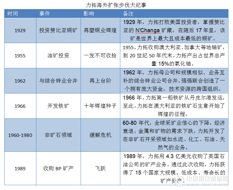 1924年,力拓啟動(dòng)了海外多元化發(fā)展戰(zhàn)略,海外擴(kuò)張不但為日后力拓成功脫身西班牙泥潭創(chuàng)造了有利條件,而且?guī)椭ν爻蔀閲?guó)際化的礦業(yè)巨頭。2000年,力拓穩(wěn)穩(wěn)坐上全球礦業(yè)巨頭寶座,全球總資產(chǎn)超百億美元。