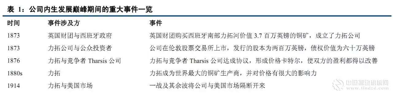 1873年,英國(guó)財(cái)團(tuán)向西班牙政府購(gòu)買(mǎi)了位于西班牙南部力拓河價(jià)值3.7百萬(wàn)英鎊的銅礦,成立了最初的力拓公司。隨后,通過(guò)不斷地?cái)U(kuò)大運(yùn)營(yíng),19世紀(jì)80年代,力拓成為了世界最大的銅礦生產(chǎn)商,產(chǎn)量占到全球銅礦總產(chǎn)量的8%。