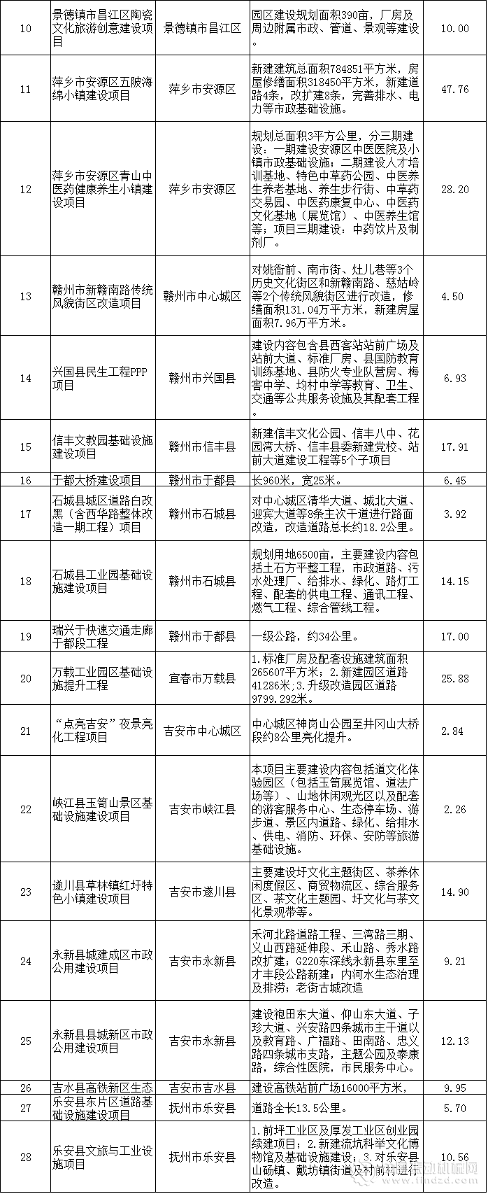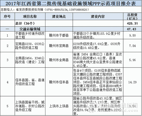 日前,江西發(fā)改委發(fā)布2017年江西省傳統(tǒng)基礎(chǔ)設(shè)施領(lǐng)域第二批政府和社會(huì)資本合作(PPP)推介項(xiàng)目。此次推介PPP項(xiàng)目共43個(gè),這43個(gè)項(xiàng)目總投資453.14億元,其中與基建相關(guān)的項(xiàng)目36個(gè),總投資425.31億元。具體如下: