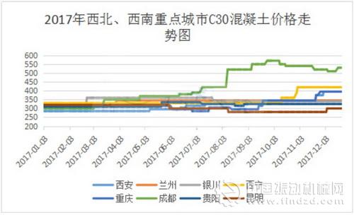 西南地區(qū)年初混凝土行情整體低位運行,二季度市場需求回升,原材料價格上漲,西南大部分地區(qū)混凝土價格小幅上漲20-30元/方。三季度市場需求低迷,重慶、云南、貴州地區(qū)混凝土價格小幅回落,而四川地區(qū)受環(huán)保整治和運輸治超影響,砂石成本大幅上漲,原本淡季混凝土價格不但不降,反而大幅上漲,最高C30報價漲到570元/方。四季度,市場需求回暖,除四川地區(qū)因環(huán)保整治放緩,商混價格小幅回落以外,其他區(qū)域相繼上調(diào)商混價格30-50元/方。截止12月,西南區(qū)域四川地區(qū)混凝土價格最高,C30報價540元/方,高出低價區(qū)240元/方。
