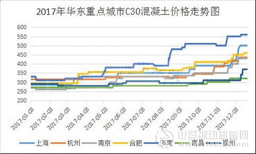 華東地區(qū)混凝土市場1-2月需求低迷,商混價格小幅回落;3月-6月步入傳統(tǒng)銷售旺季,市場需求回升,原材料價格上漲,商混價格逐漸攀升;7-8月華東地區(qū)高溫多雨,市場需求放緩,商混價格漲勢放緩,行情趨穩(wěn);9月份受環(huán)保整治影響,華東地區(qū)砂石資源緊缺,價格大幅拉漲,山東、安徽地區(qū)商混價格一天一價,持續(xù)高漲,江浙滬地區(qū)緊跟其后;10月份受國慶節(jié)影響,商混行情放緩,10月下旬至今,華東地區(qū)處于傳統(tǒng)銷售旺季,由于水泥企業(yè)執(zhí)行錯峰生產(chǎn),水泥庫存低位,價格大幅上漲,部分區(qū)域漲幅超過200元/噸,對混凝土生產(chǎn)成本沖擊巨大,混凝土價格被迫上漲。
