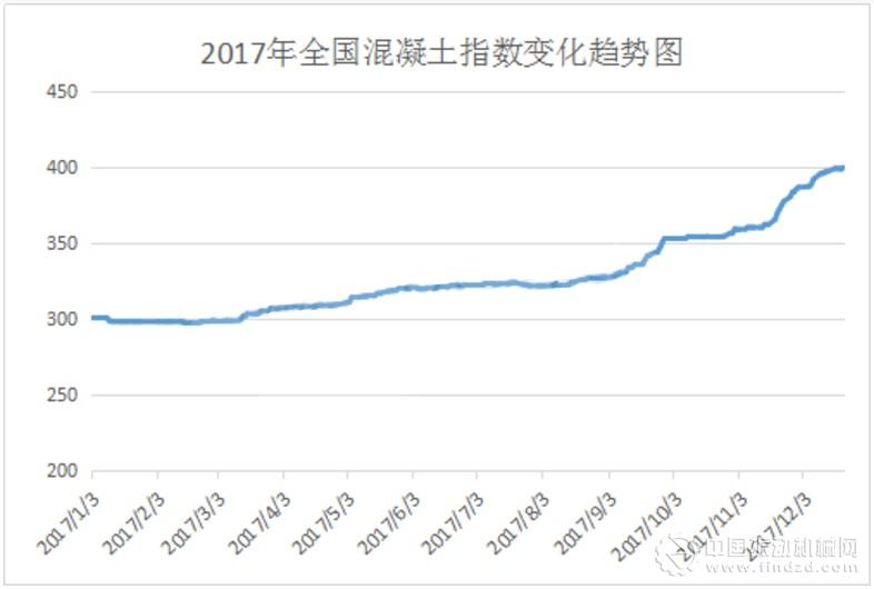 2017上半年全國混凝土市場行情緩慢上行,下半年行情突飛猛漲,尤其是9月、11月、12月份價格漲勢明顯。截止12月22日全國混凝土價格指數(shù)已達到400點,較年初價格指數(shù)上漲100點,再創(chuàng)歷史新高。
