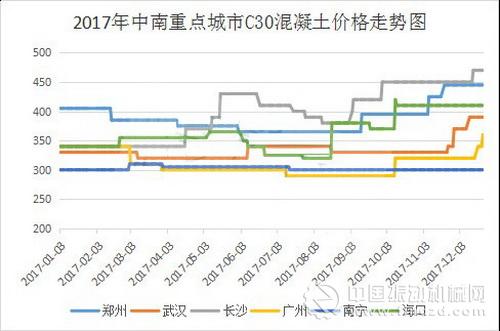 華中地區(qū)2017年混凝土行情跌漲起伏,一季度華中各省混凝土價格持續(xù)下行,二季度兩湖地區(qū)混凝土行情止跌回暖,河南地區(qū)價格持續(xù)走低,三季度華中地區(qū)高溫多雨,工程開工率低,商混市場競爭激烈,行情弱勢運行,9月份受砂石、水泥價格大幅拉漲和運輸治超影響,華中地區(qū)混凝土行情回升,其中湖南地區(qū)表現(xiàn)積極,10月下旬河南、湖北混凝土價格也持續(xù)大幅上漲。2017年華中區(qū)域湖南地區(qū)混凝土行情波動最大,而且價格上漲幅度最高,C30價格最低與最高相差130元/方。