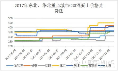 華北地區(qū)年初市場尚未恢復,商混行情平穩(wěn),二季度市場需求大幅回升,水泥價格大幅拉漲,商混價格隨之上漲,其中北京、天津原材料供應主要靠河北地區(qū)輸入,原材料價格上漲,加上運輸成本較高,商混價格相對河北地區(qū)高出100元/方。三季度受高溫多雨天氣影響,華北地區(qū)商混行情持續(xù)回落,跌至年初水平,直至四季度環(huán)保整治影響,砂石、水泥價格一天一價,混凝土成本大幅提升,加強四季度市場需求旺盛,商混供應緊張,京津冀地區(qū)混凝土價格累計上漲80-100元/方。截止12月,華北區(qū)域北京地區(qū)混凝土價格最高,C30報價達到450元/方。