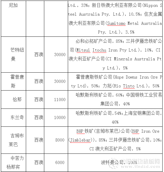 澳大利亞主要的鐵礦石生產(chǎn)礦山有:哈默斯利(Hamersley),揚(yáng)迪(Yandi)、芒特高茲渥斯(Mount Goldsworthy)、芒特紐曼(Mount Newman)、恰那(Channar)等。其中產(chǎn)能10000千t/a的礦山9座。各主要生產(chǎn)礦山的產(chǎn)能,如下圖: