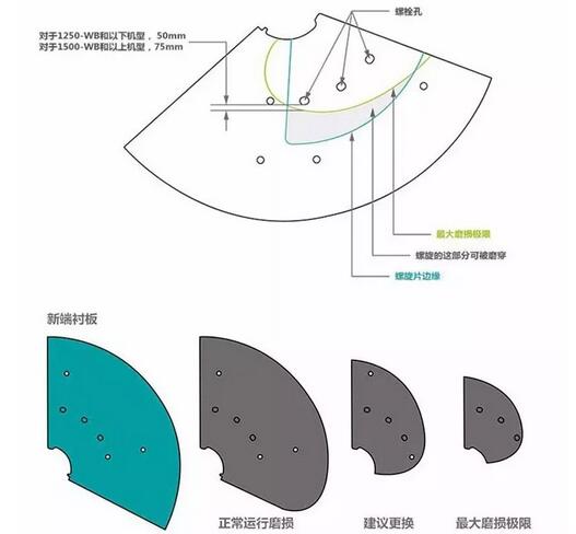 通常,現(xiàn)場(chǎng)的襯板更換較為頻繁。下圖列示例顯示端襯板和相關(guān)螺旋片的可磨損程度。淺綠色線所示為最大磨損極限。依據(jù)VTM機(jī)型的不同,螺旋片和端襯板可以磨損至距離最近的螺栓2英寸處,且仍能夠?yàn)樾露艘r板提供足夠的結(jié)構(gòu)支承。