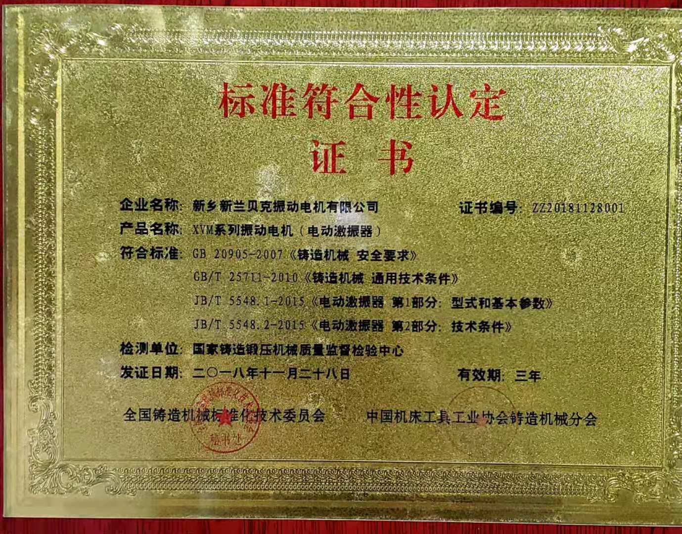 中國振動機械網(wǎng)獲悉:新鄉(xiāng)新蘭貝克振動電機有限公司XVM系列振動電機產(chǎn)品通過國家鑄造鍛壓機械質(zhì)量監(jiān)督檢驗中心、全國鑄造機械標(biāo)準(zhǔn)化技術(shù)委員會的技術(shù)質(zhì)量認(rèn)證,是行業(yè)內(nèi)唯一通過認(rèn)證的振動電機企業(yè)。