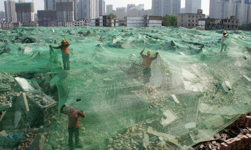 隨著城市發(fā)展,中國每年會產(chǎn)生大量建筑垃圾。圖為西安的一處工地上,工人用防塵網(wǎng)遮蓋建筑垃圾。