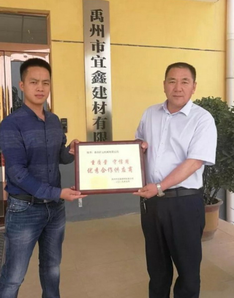 近日,禹州宜鑫建材有限公司授予南昌礦山機械有限公司“重合同 守信用 優(yōu)秀合作供應(yīng)商”的稱號。