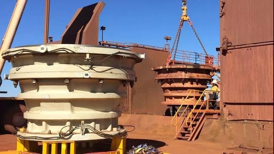 當(dāng)有些客戶要求粗碎旋回破碎機(jī)達(dá)到最高水平的開機(jī)率時,還可以考慮第三種方案。切換上機(jī)架預(yù)先(在現(xiàn)場或場外)裝配好襯板的整體式機(jī)架,拆卸現(xiàn)有機(jī)架后,無需拆卸定錐襯板,即可進(jìn)行安裝。