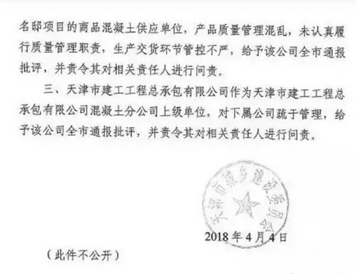鳳凰網(wǎng)房產(chǎn)消息,2018年4月,一份傳播甚廣的天津市建委的內(nèi)部文件顯示,天房樾梅江項(xiàng)目個(gè)別棟號(hào)存在混凝土強(qiáng)度不符合設(shè)計(jì)要求的質(zhì)量問題。該文件要求不公開,但在天津相關(guān)政府網(wǎng)站掛出。