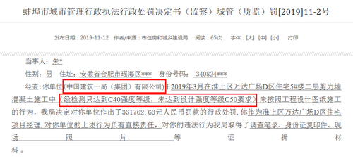 據(jù)蚌埠住房城鄉(xiāng)建設(shè)局官方網(wǎng)站公開的行政處罰決定書顯示,11月12日,該局向淮上區(qū)萬達(dá)廣場(chǎng)D區(qū)住宅項(xiàng)目經(jīng)理朱某、中國建筑一局(集團(tuán))有限公司等相關(guān)單位或人員作出處罰。決定書稱,中國建筑一局(集團(tuán))有限公司在2019年3月淮上區(qū)萬達(dá)廣場(chǎng)D區(qū)住宅5#樓二層剪力墻混凝土施工過程中,存在未按照工程設(shè)計(jì)圖紙施工的行為,“經(jīng)檢測(cè)只達(dá)到C40強(qiáng)度等級(jí),未達(dá)到設(shè)計(jì)強(qiáng)度等級(jí)C50要求”。