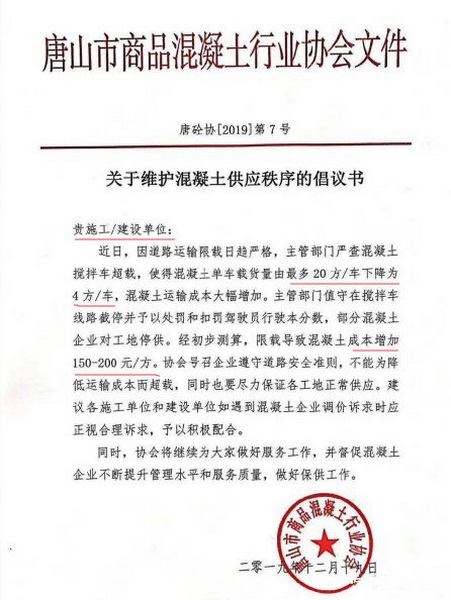 據(jù)悉,近日,唐山地區(qū)混凝土行業(yè)協(xié)會(huì)發(fā)文《關(guān)于維護(hù)混凝土供應(yīng)秩序的倡議書》第7、8號(hào)文件。文件分別對(duì)下游施工企業(yè)的采購(gòu)以及混凝土企業(yè)的供應(yīng)提出相關(guān)建議。近期唐山地區(qū)車輛限載,混凝土企業(yè)攪拌車載貨量由20方下降至4方,混凝土運(yùn)輸成本上升。經(jīng)初步測(cè)算,混凝土成本上升150-200元/方。