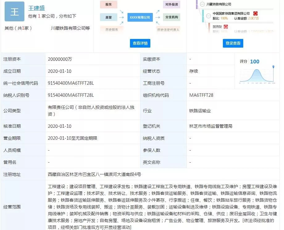 從國(guó)家企業(yè)信用信息公示系統(tǒng)了解到,川藏鐵路有限公司已于2020年1月10日成立,注冊(cè)資本2000億元,注冊(cè)地點(diǎn)位于西藏自治區(qū)林芝市,中國(guó)國(guó)家鐵路集團(tuán)有限公司持有其100%股份。川藏鐵路有限公司的正式成立,將大大加快川藏鐵路項(xiàng)目建設(shè)加快推進(jìn)。