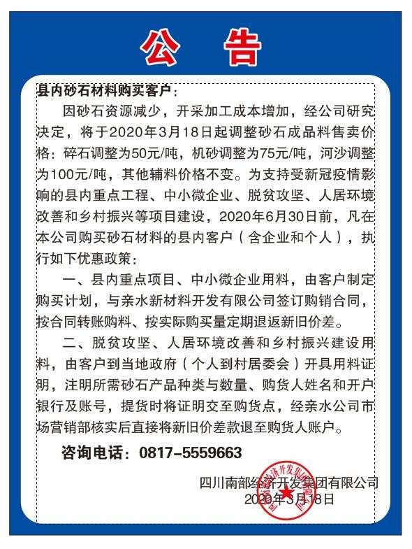 2、脫貧攻堅(jiān)、人居環(huán)境改善和鄉(xiāng)村振興建設(shè)用料,由客戶到當(dāng)?shù)卣?個(gè)人到村居委會(huì))開具用料證明,注明所需砂石產(chǎn)品種類與數(shù)量、購(gòu)貨人姓名和開戶銀行及賬號(hào),提貨時(shí)將證明交至購(gòu)貨點(diǎn),經(jīng)親水公司市場(chǎng)營(yíng)銷部核實(shí)后直接將新舊價(jià)差款退至購(gòu)貨人賬戶。(咨詢電話:0817—5559663)