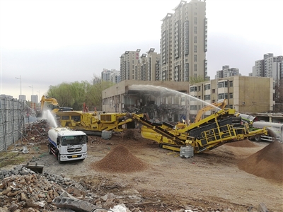 噴淋設(shè)備和移動(dòng)破碎機(jī)同時(shí)作業(yè),實(shí)現(xiàn)“綠色拆遷”。