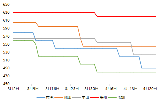 ◆東莞地區(qū)混凝土價格累計跌幅在90元/方,C30主流品牌報價490元/方。