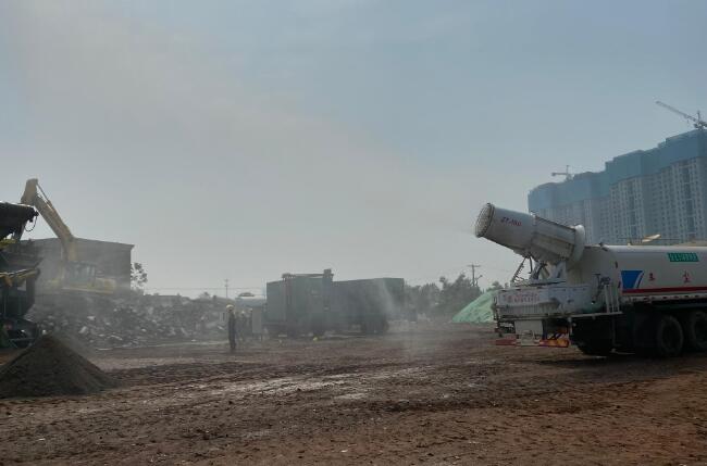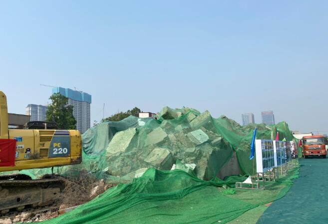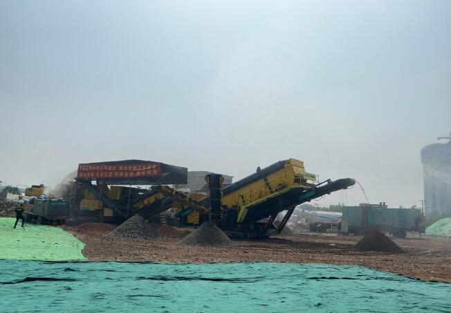 機器轟鳴,傳送帶勻速運轉,拆遷產生的12萬噸碎磚瓦、混凝土塊等建筑垃圾,正在防塵網(wǎng)覆蓋下等待煥發(fā)“新生”。在一旁霧炮車的灑水降塵下,大塊大塊原生建筑垃圾被機器入料口“吞”入,瞬間不見了蹤影,短短幾分鐘過后,從另一端生產出3種粒徑規(guī)格的再生骨料。這便是移動式建筑垃圾資源化利用生產線。