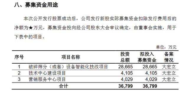 大宏立表示,本次擬募集資金3.6799億元。募集資金將用于破碎篩分(成套)設(shè)備智能化技改項(xiàng)目、技術(shù)中心建設(shè)項(xiàng)目以及營銷服務(wù)中心項(xiàng)目。其中,破碎篩分(成套)設(shè)備智能化技改項(xiàng)目預(yù)計(jì)投入2.87億元募集資金,技術(shù)中心建設(shè)項(xiàng)目擬使用4,105萬元,剩余的4,029萬元將投入到營銷服務(wù)中心項(xiàng)目之中。