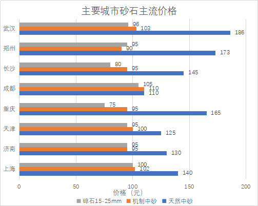 我國砂石礦具有分布范圍廣、采選工藝簡單、設(shè)計生產(chǎn)能力相對較低和運輸半徑短的特點。近年“綠水青山就是金山銀山”的理念深入人心,各地方自然資源主管部門逐步關(guān)閉了部分落后的小型砂石礦山,導(dǎo)致2018年京津冀、廣東和江蘇等地區(qū)砂石價格漲幅增大,2019年某些地區(qū)的砂石礦山資源出讓起始價達(dá)到約60元/噸。截止2020年4月,受新型冠狀病毒疫情影響,全國砂石價格總體下降約2%,全國機制砂均價99.47元/噸,天然砂均價在127.05元/噸,相較2018年前,砂石價格仍處于一個較高水平(截止2020年4月主要城市砂石主流價格見下圖)。