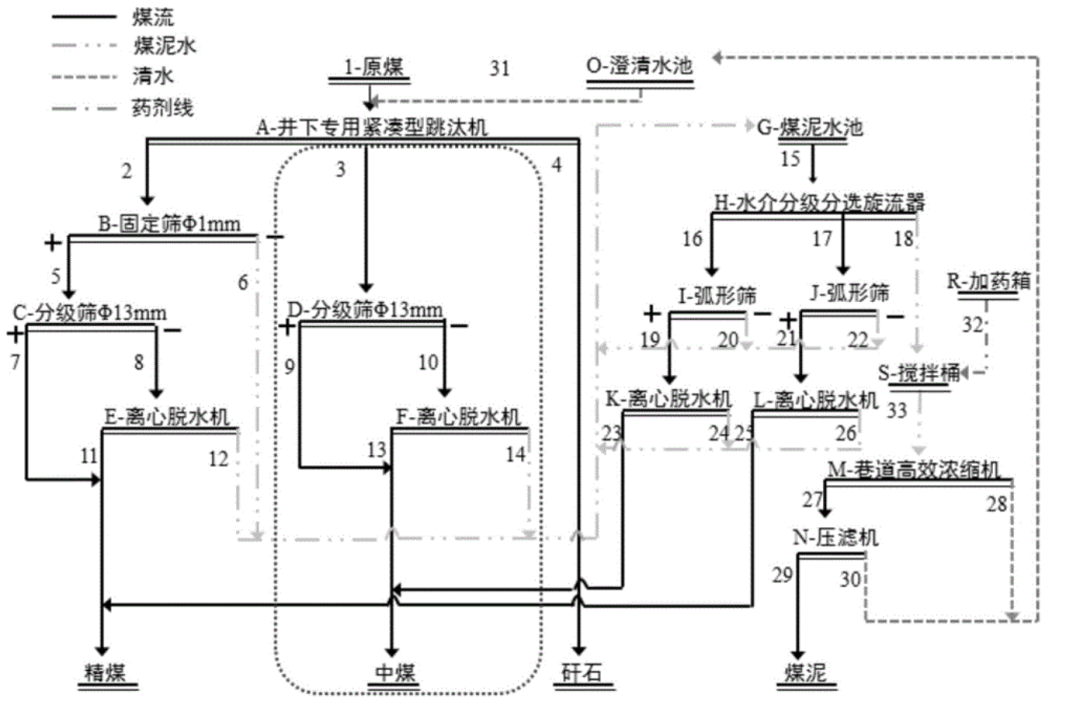 原煤給入井下專用緊湊型跳汰機(jī)排出精煤,經(jīng)φ1mm固定篩脫水,精煤再由φ13mm分級(jí)篩分,末精煤水由精煤離心脫水機(jī)脫水后得到末精煤和離心液;跳汰中煤排出由φ13mm分級(jí)篩分級(jí),分為塊中煤和末中煤,末中煤由中煤離心脫水機(jī)脫水得到末中煤和離心液;產(chǎn)生的煤泥水送到水介質(zhì)分級(jí)分選旋流器,旋流器一段起分級(jí)作用,一段底流進(jìn)入旋流器二段進(jìn)行分選,得到二段溢流的粗精煤泥和底流粗中煤泥;粗中煤泥和粗精煤泥分別經(jīng)過粗中煤泥弧形篩I和粗精煤泥弧形篩J得到篩上預(yù)脫水后的粗中煤泥和粗精煤泥,脫水后得到粗精煤泥和粗精煤泥。