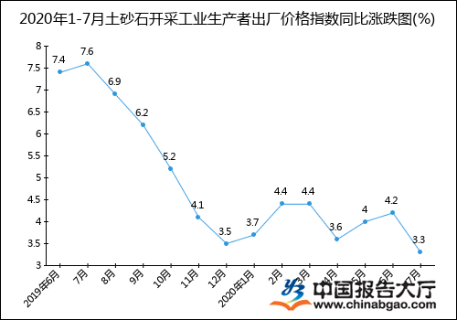 根據(jù)中國報告大廳對2020年1-7月土砂石開采工業(yè)生產(chǎn)者出廠價格指數(shù)進行監(jiān)測統(tǒng)計顯示:2020年7月土砂石開采工業(yè)生產(chǎn)者出廠價格指數(shù)為103.3,同比增長3.3%。