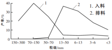 破碎機(jī)經(jīng)過轉(zhuǎn)速調(diào)整和齒形處理后,超?,F(xiàn)象大為改觀,經(jīng)現(xiàn)場對破碎前后采樣分析,得到破碎機(jī)入料和排料粒度組成和粒度組成曲線分別如表1和圖2所示。